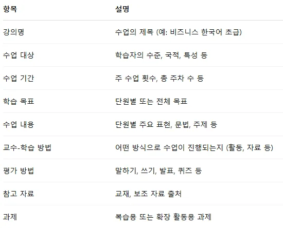 ⚠️ 3~5번까지의 사항은 기관에서 제공하는 강의계획안 양식에 따라 생략할 수도 있습니다.