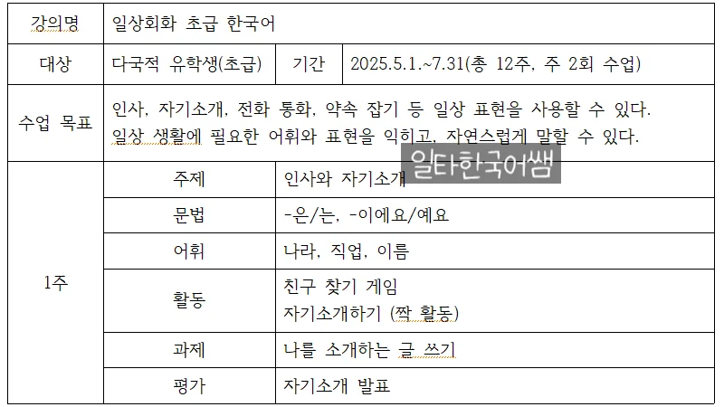 강의계획안은 수업의 설계도이자, 학습자에게 제공되는 수업의 청사진이라고 할 수 있는데요. 특히 한국어 교육은 학습자의 수준, 국적, 학습 목적이 다양하기 때문에, 강의계획안의 중요성은 더욱 커집니다.