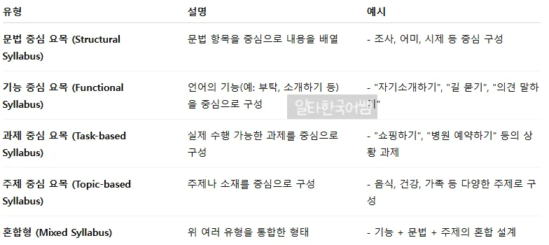그럼 한국어 교육의 교수 요목은 어떤 유형이 있고 어떻게 구성될까요?