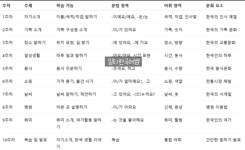 5. 초급 한국어 교수 요목 예시 (10주 과정)