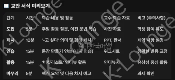 막막했던 교안 작성이 이 샘플 하나로 조금은 쉬워지셨나요? 선생님의 수업 스타일대로 이 샘플을 자유롭게 변형해 보세요.