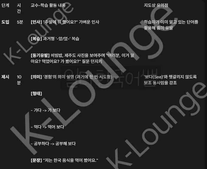 Tip 2: 활용 단계에서 '가 본 적이 있다'와 차이점을 묻는 학생이 있다면, 초급 수준에서는 비슷하게 사용되지만 '-아/어 보다'는 '시도'의 느낌이 더 강하다는 정도로만 가볍게 설명해 주시는 게 좋습니다.