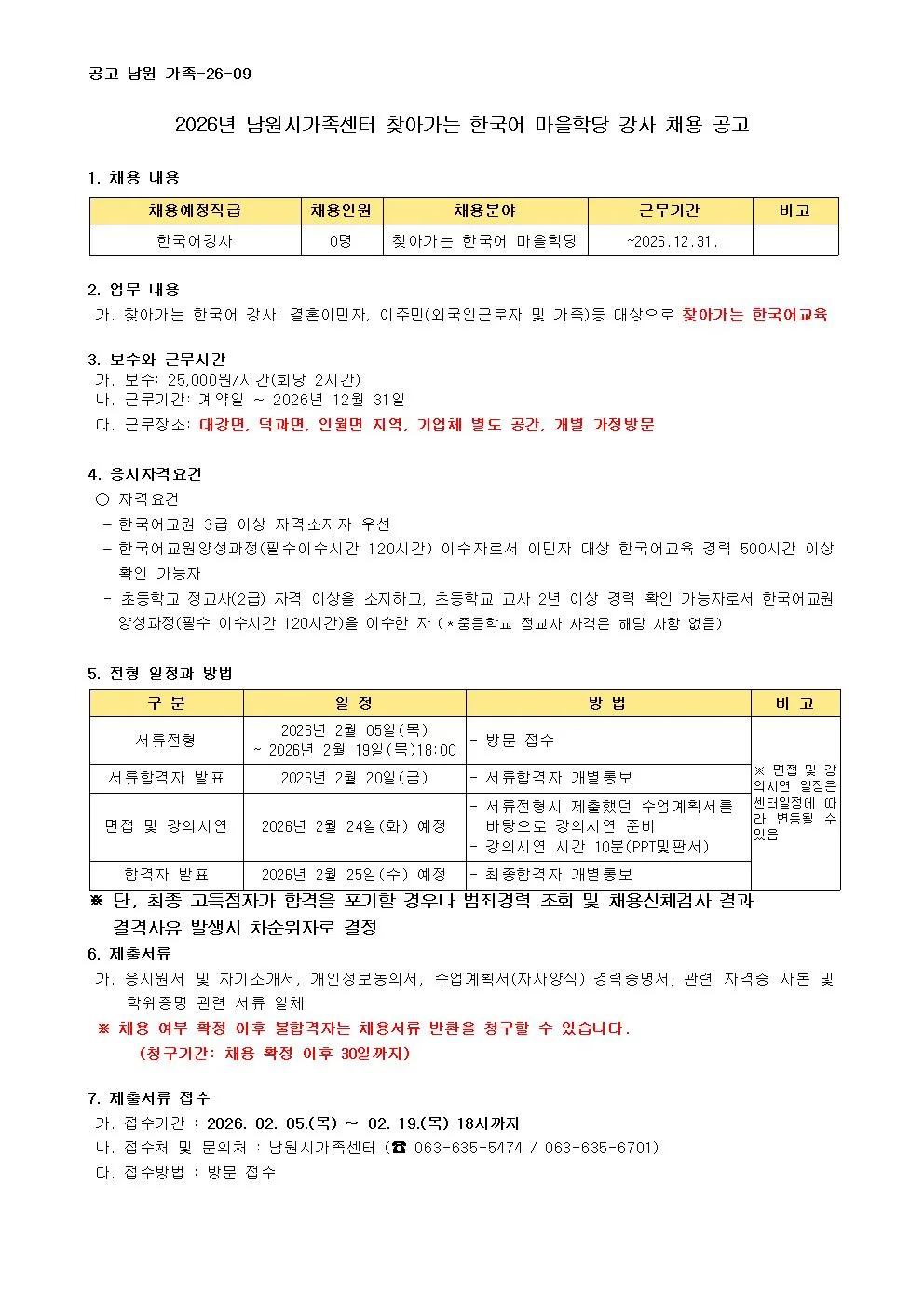 [남원]2026년 남원시가족센터 찾아가는 한국어 마을학당 강사 채용 공고