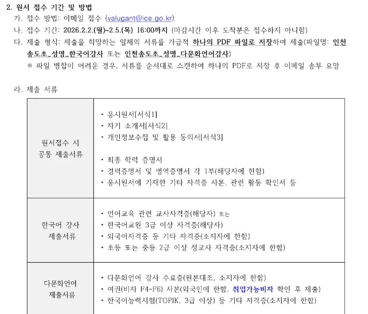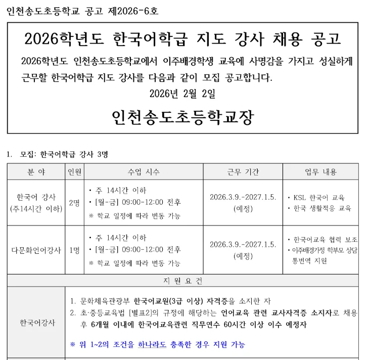 [인천]2026학년도 한국어학급 지도강사 및 다문화언어강사 채용